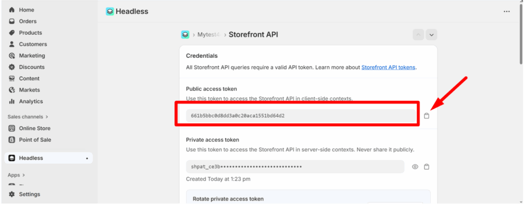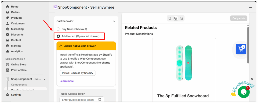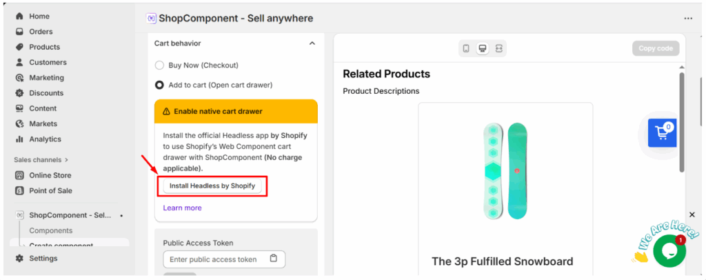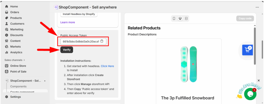 >> Go back to the ShopComponent’s admin panel where you have created the component, and below the “Public Access Token” field, paste the code and click on “Verify”.