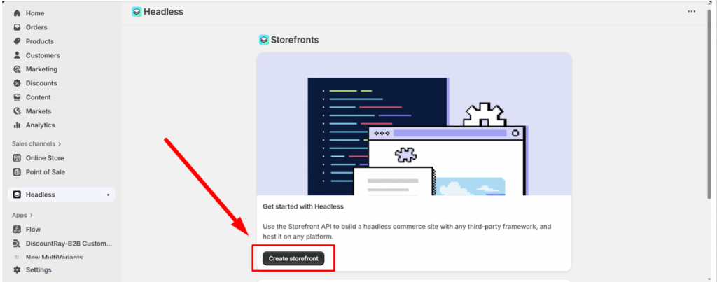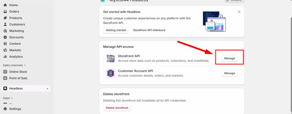 >> From the “Manage API Access” section click on “Manage” button beside “Storefront API”.